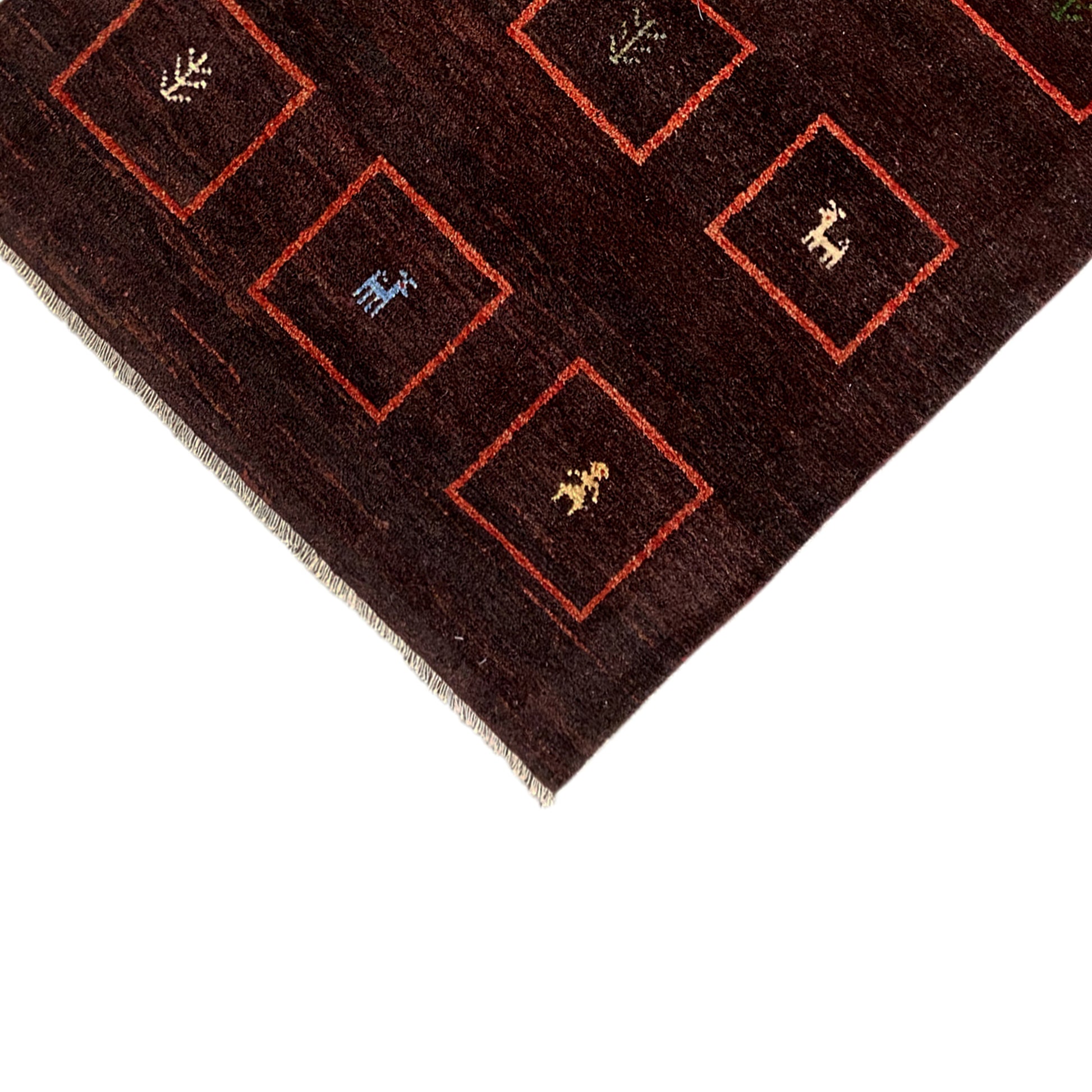 Questo espressivo tappeto Gabbeh annodato a mano, di dimensioni 147x99cm, è realizzato in lana filata a mano e tinta con coloranti vegetali, e si distingue per un marrone intenso come colore principale. Il suo motivo a griglia tradizionale presenta in ogni quadrato rosso motivi unici, stilizzati di animali e figure che raccontano una storia. Questo tappeto porta un calore autentico e un fascino rustico e tribale in ogni casa ed è un pezzo unico durevole.