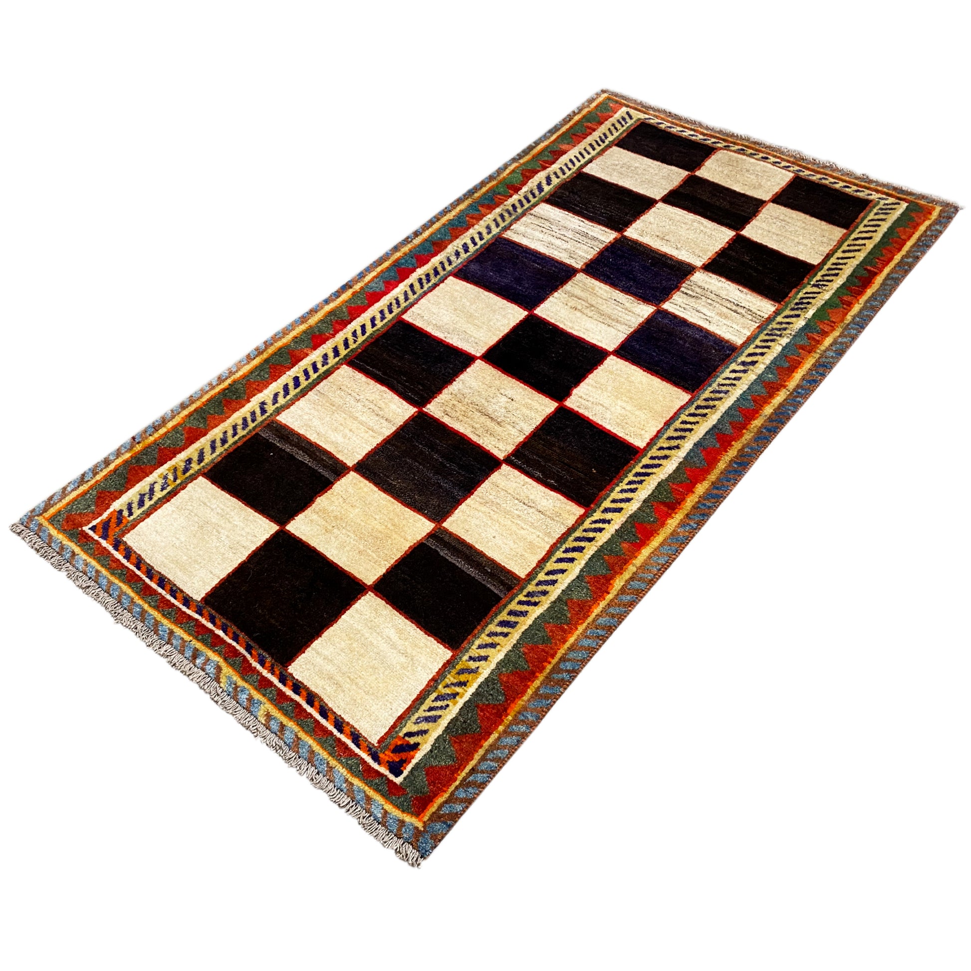 Questo corridore Gabbeh annodato a mano, realizzato con lana filata a mano e tinta con coloranti vegetali, affascina con un classico motivo a scacchiera bianco e nero, incorniciato da un vivace bordo multicolore. Con le sue dimensioni di 194x100 cm, è un pezzo di grande impatto che conferisce ai corridoi, agli ingressi o agli spazi allungati un'estetica dinamica e al contempo senza tempo. La combinazione di artigianato tradizionale e motivo grafico rende questo corridore un elemento d'attrazione speciale, che emana sia modernità sia fascino tradizionale, creando un'atmosfera accogliente.