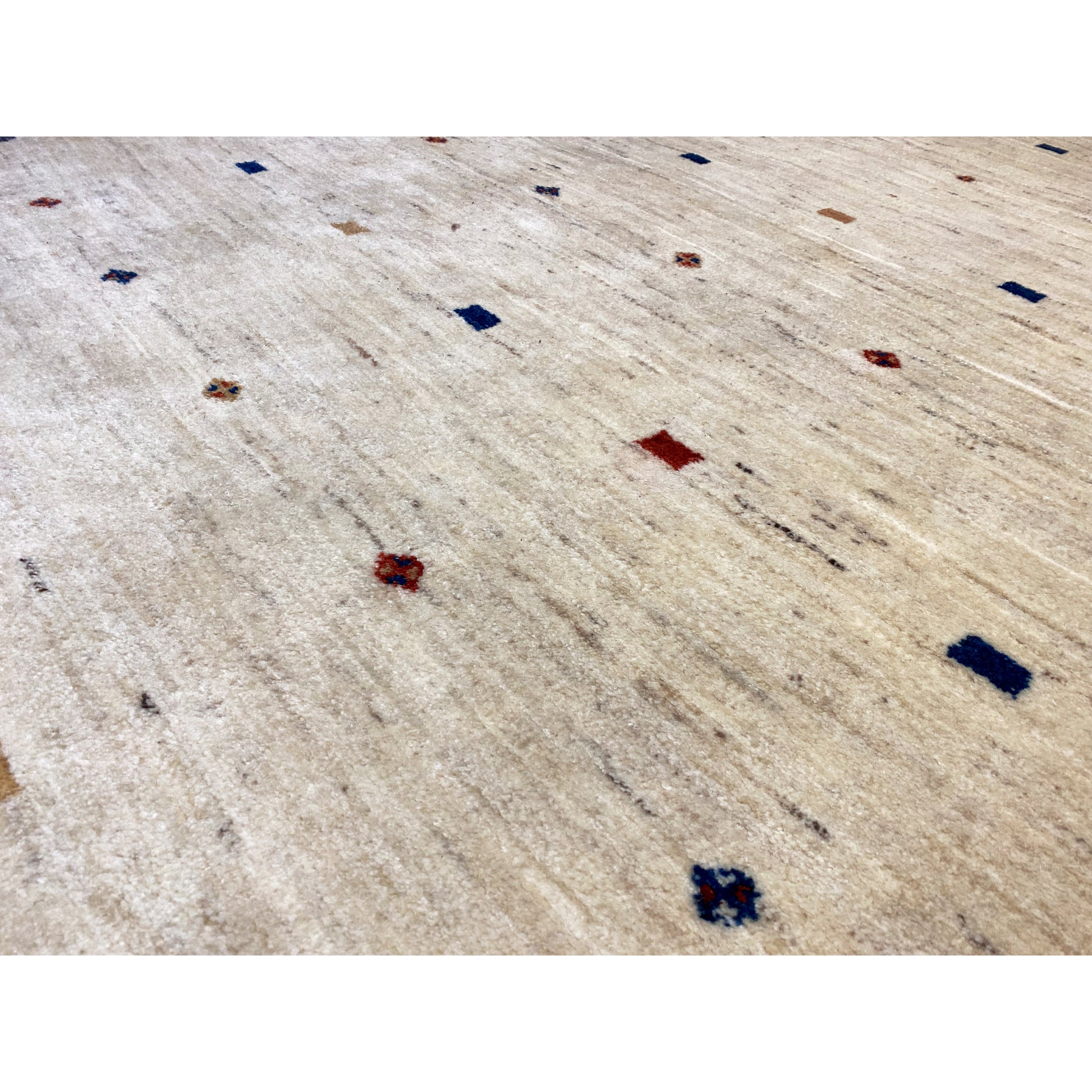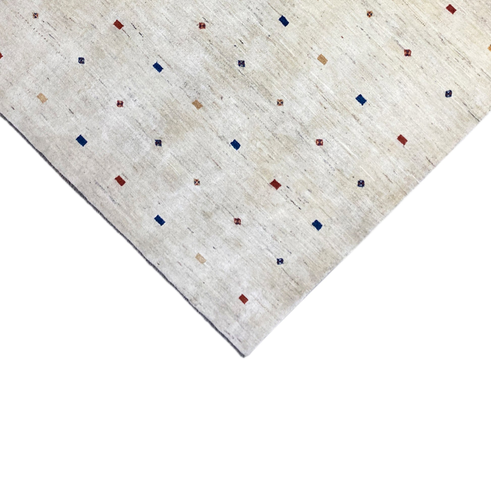 Questo elegante tappeto Gabbeh annodato a mano, realizzato con lana filata a mano e tinta con coloranti vegetali, si distingue per il suo tranquillo sfondo color beige, delicatamente punteggiato da piccoli accenti colorati in forme geometriche. Con le sue generose dimensioni di 286x196 cm, è un complemento ideale per ambienti moderni o minimalisti, creando un'atmosfera luminosa e rilassante. Il motivo semplice ma accattivante e la naturale consistenza della lana rendono questo tappeto un pezzo senza tempo, che unisce eleganza e comfort in modo discreto.