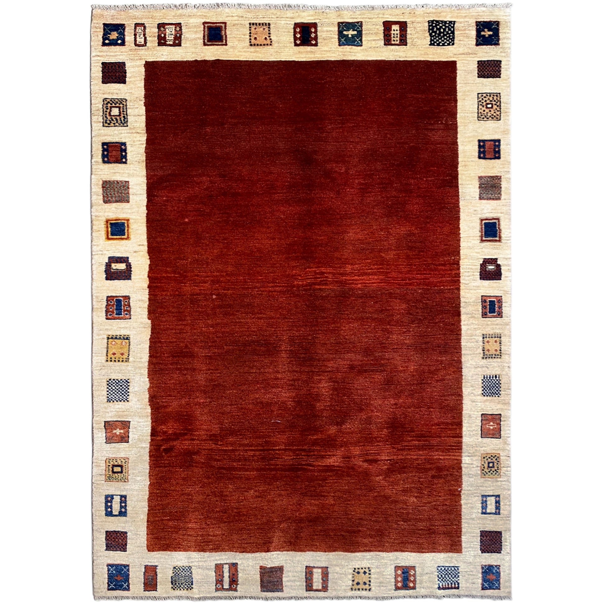 Questo impressionante tappeto Gabbeh annodato a mano, realizzato con lana filata a mano e tinta con coloranti vegetali, si distingue per il suo caldo nucleo rosso, incorniciato da un ampio bordo beige con motivi geometrici colorati. Con le sue generose dimensioni di 287x197 cm, è un punto focale centrale che conferisce a ogni ambiente domestico un'atmosfera accogliente e al contempo artistica. L'armonia tra il colore principale intenso e i dettagli giocosi del bordo rende questo tappeto un elemento versatile, adatto sia a stili d'arredo tradizionali che moderni, raccontando al contempo una storia di artigianato.