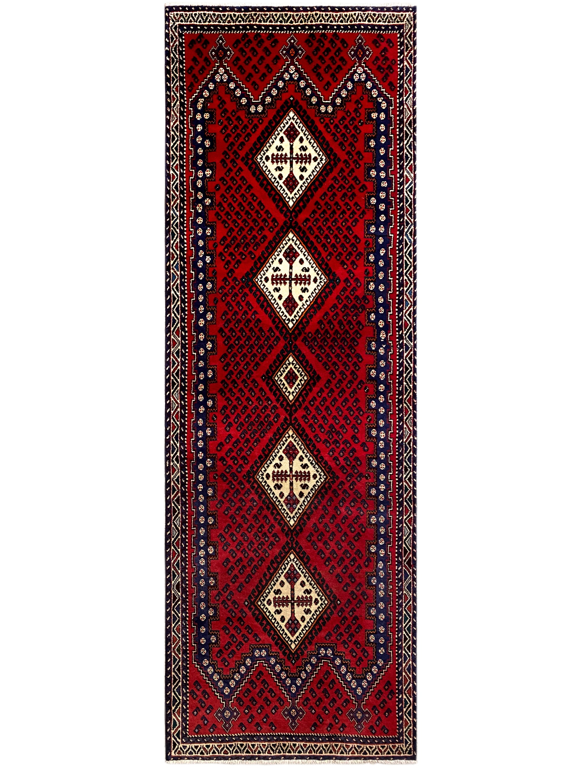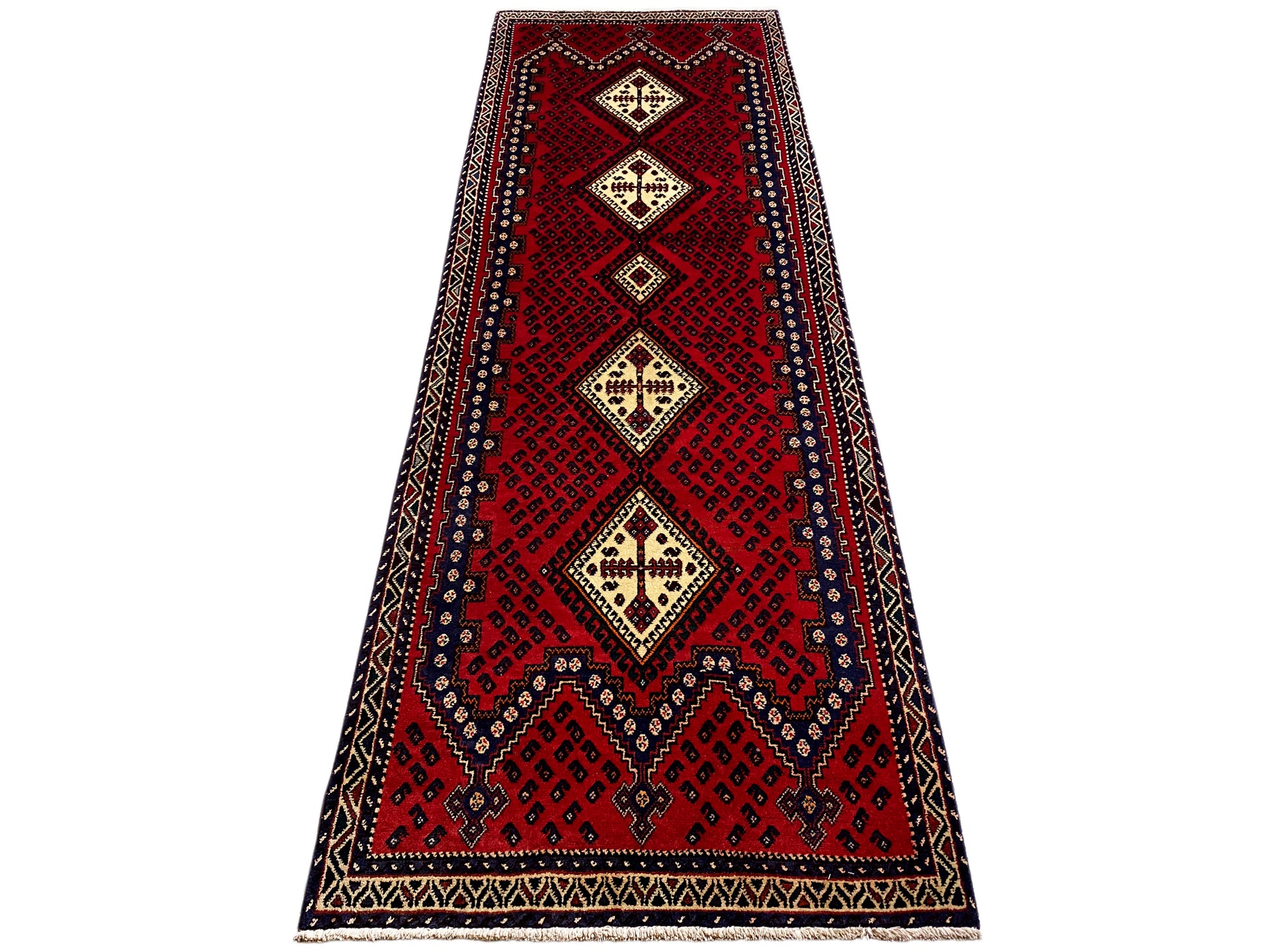 Questo tappeto Sirjan a corsia annodato a mano presenta un design tradizionale geometrico in una tonalità di rosso intenso, accentuato da dettagli crema, blu e neri. Il motivo è composto da una serie di rombi stilizzati disposti lungo l'asse longitudinale e incorniciati da un bordo dettagliato con elementi floreali e geometrici. Realizzato in lana di alta qualità filata a mano e tinto con colori vegetali, questo tappeto si distingue non solo per i suoi colori vivaci e il design accattivante, ma anche per la sua texture naturale e durata. Con le sue dimensioni di 282x89 cm, è ideale per valorizzare con stile corridoi, ingressi o altri spazi stretti, donando un tocco di eleganza orientale. Il motivo classico si integra perfettamente in stili di arredamento tradizionali, rustici o anche eclettici, creando un'atmosfera calda e accogliente. Questo tappeto non è solo una pavimentazione di alta qualità, ma anche una testimonianza dell'arte tradizionale persiana dell'annodatura e della bellezza naturale.
