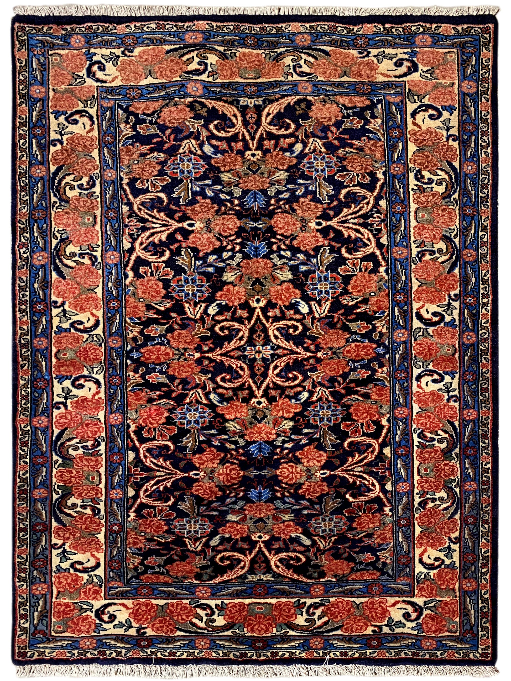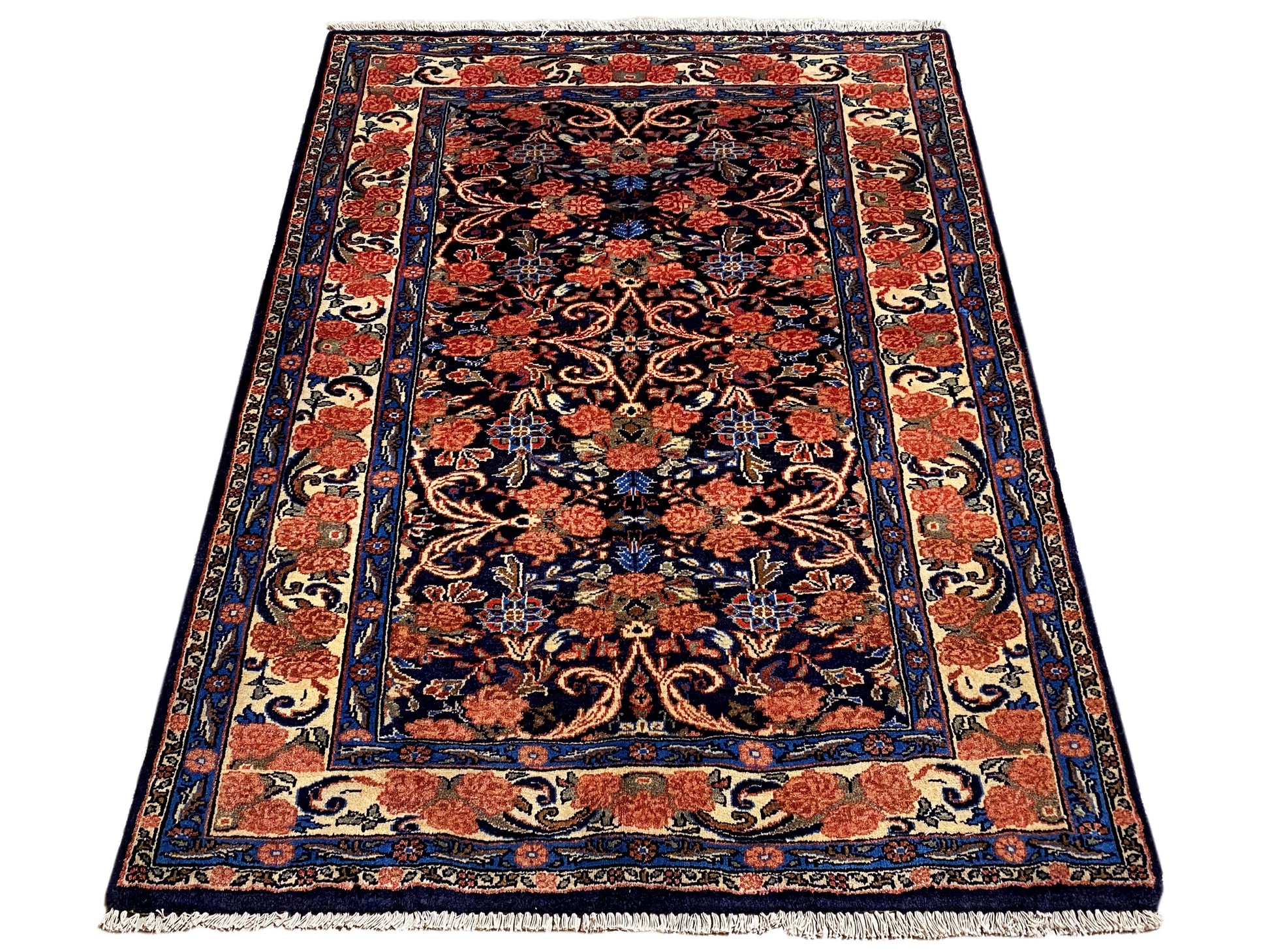 Dieser handgeknüpfte Hamedan Teppich aus handgesponnener Wolle vereint traditionelle persische Handwerkskunst mit einem eleganten floralen Muster und setzt in klassischen wie modernen Wohnräumen stilvolle Akzente; das kompakte Format von 142x102 cm passt ideal in Wohnzimmer, Flur oder Schlafzimmer, während die dunkle Blaugrundfarbe mit warmen Rot- und Beigetönen dem Raum Tiefe, Wärme und Charakter verleiht – ein langlebiger, hochwertiger Teppich, der durch seine robuste Knotendichte von 160.000 Knoten/qm, zeitlose Optik und vielseitige Einsatzmöglichkeiten überzeugt.