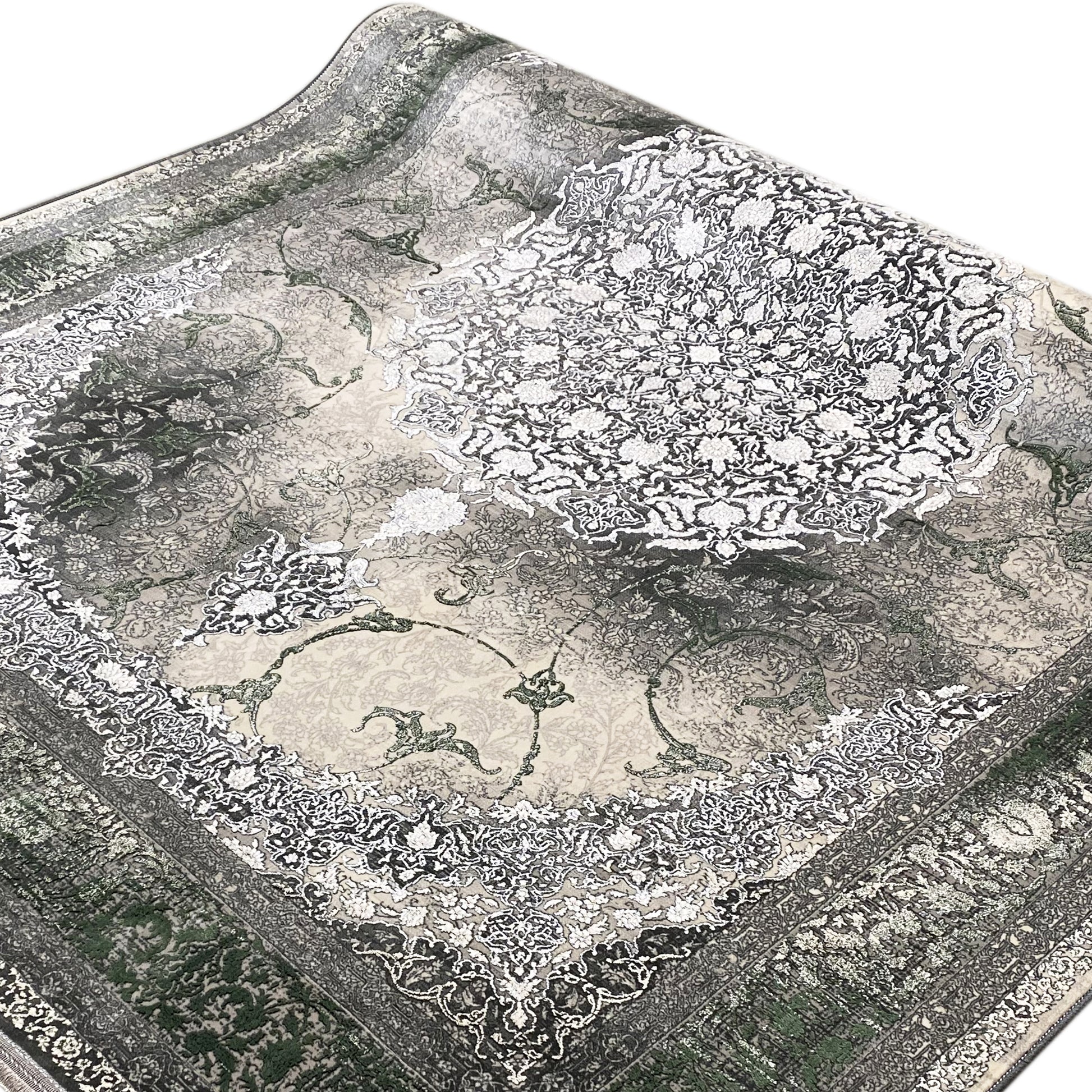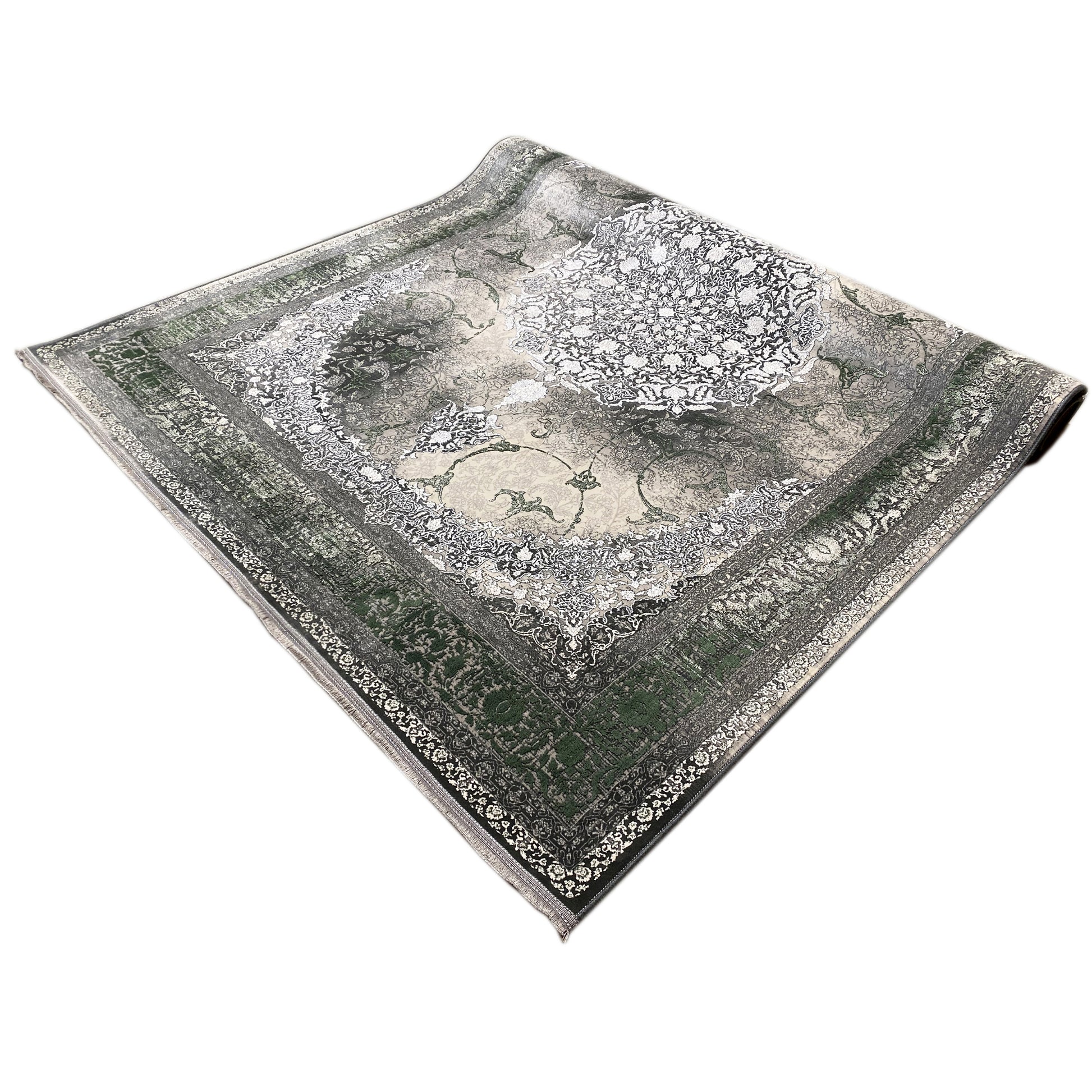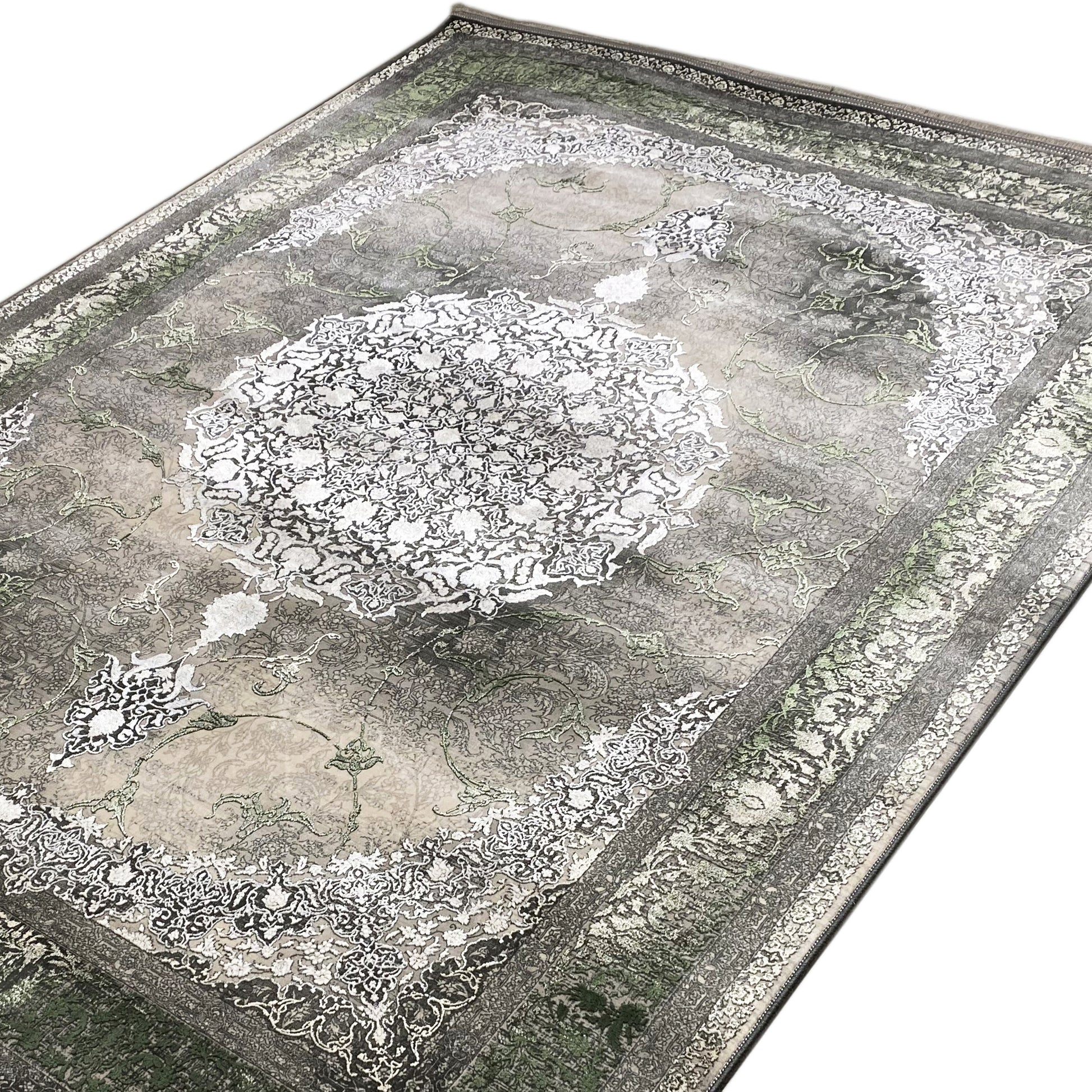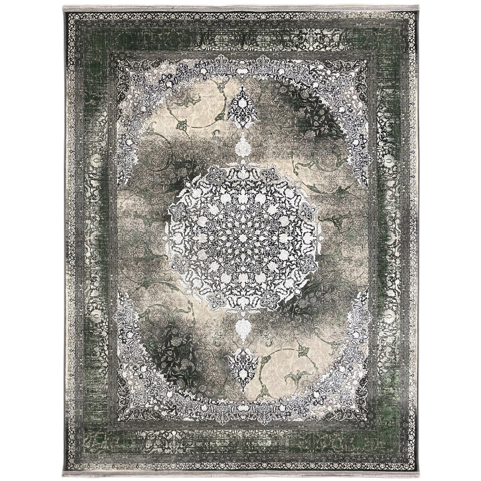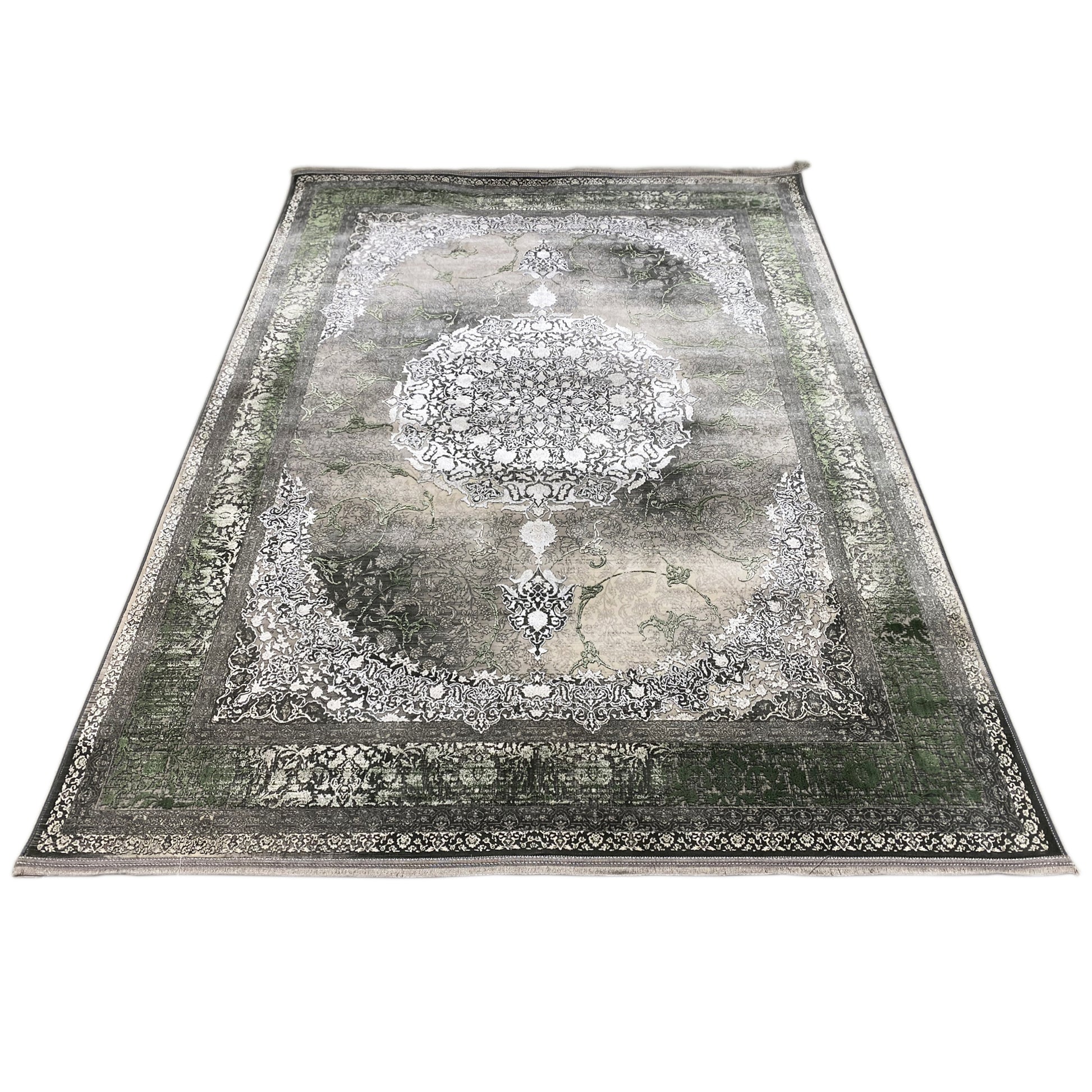 Dona alla tua casa un tocco di elegante lusso con questo splendido tappeto classico. Il raffinato medaglione centrale in tonalità grigio chiaro e crema si staglia su uno sfondo fumoso e leggermente sbiadito, incorniciato da un bordo verde intenso. Realizzato in 100% acrilico trattato termicamente, questo tappeto morbido e resistente è perfetto per aree ad alto traffico, combinando uno stile lussuoso con una moderna durabilità. Le dimensioni generose di 170x240cm sono ideali per aggiungere un punto focale elegante al tuo soggiorno o camera da letto.