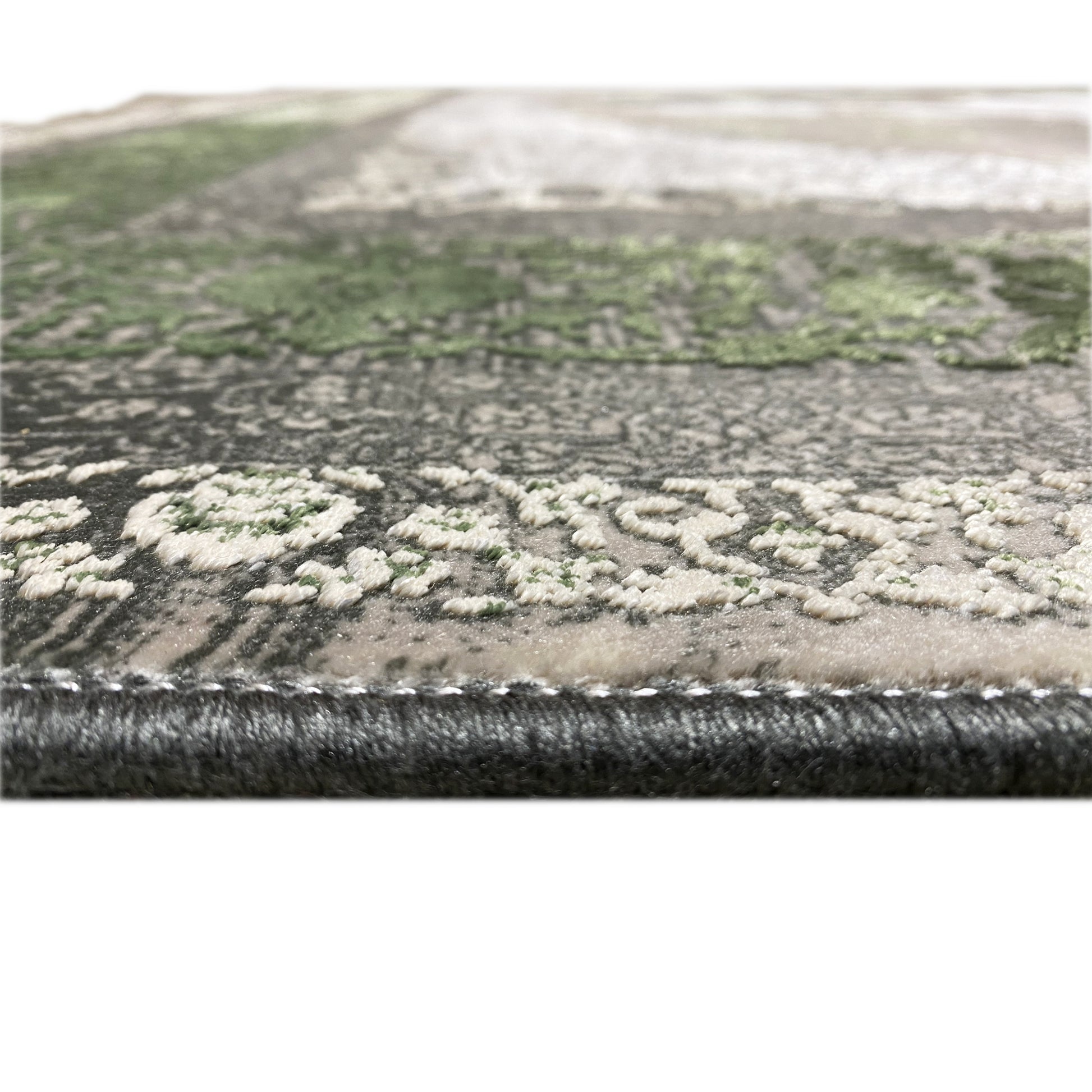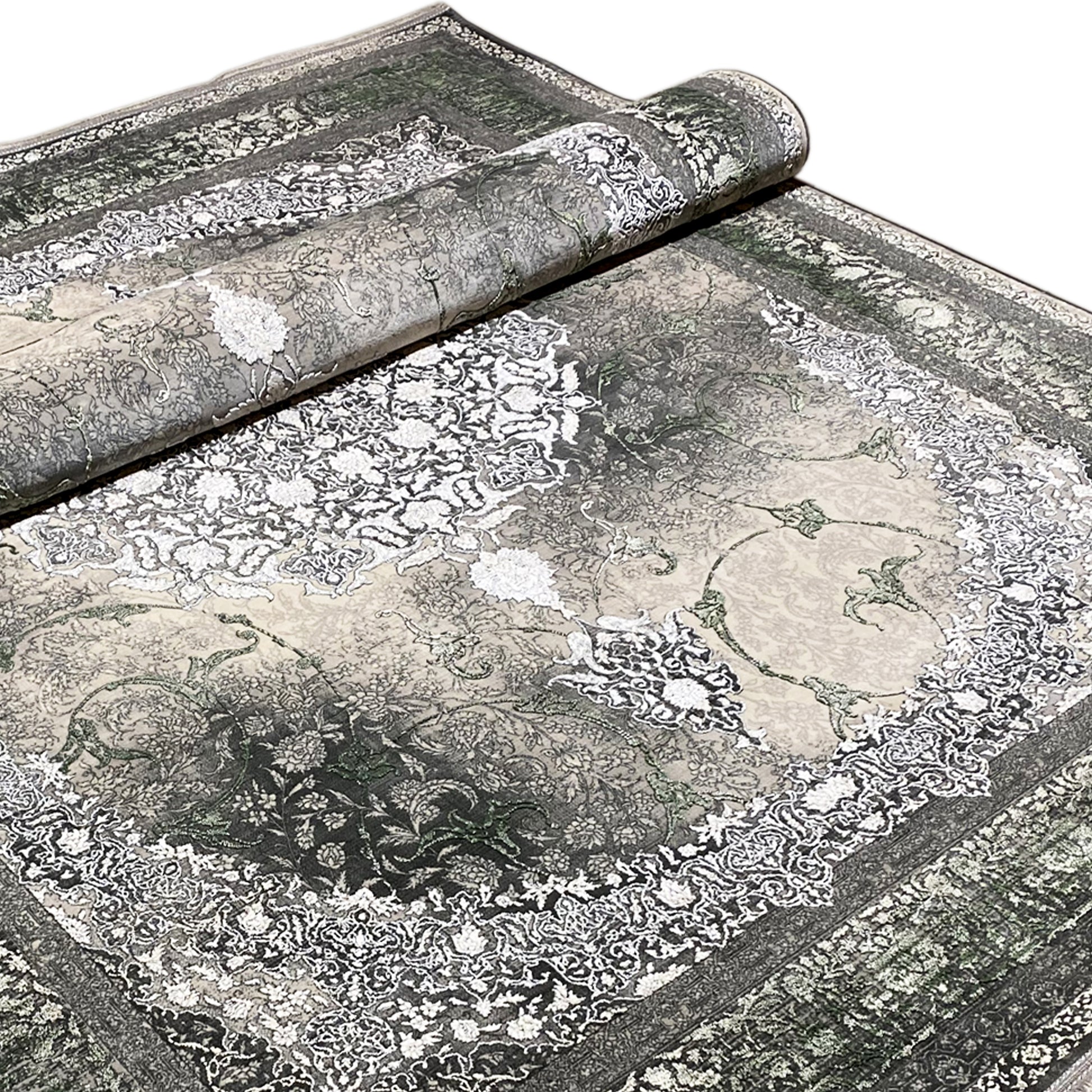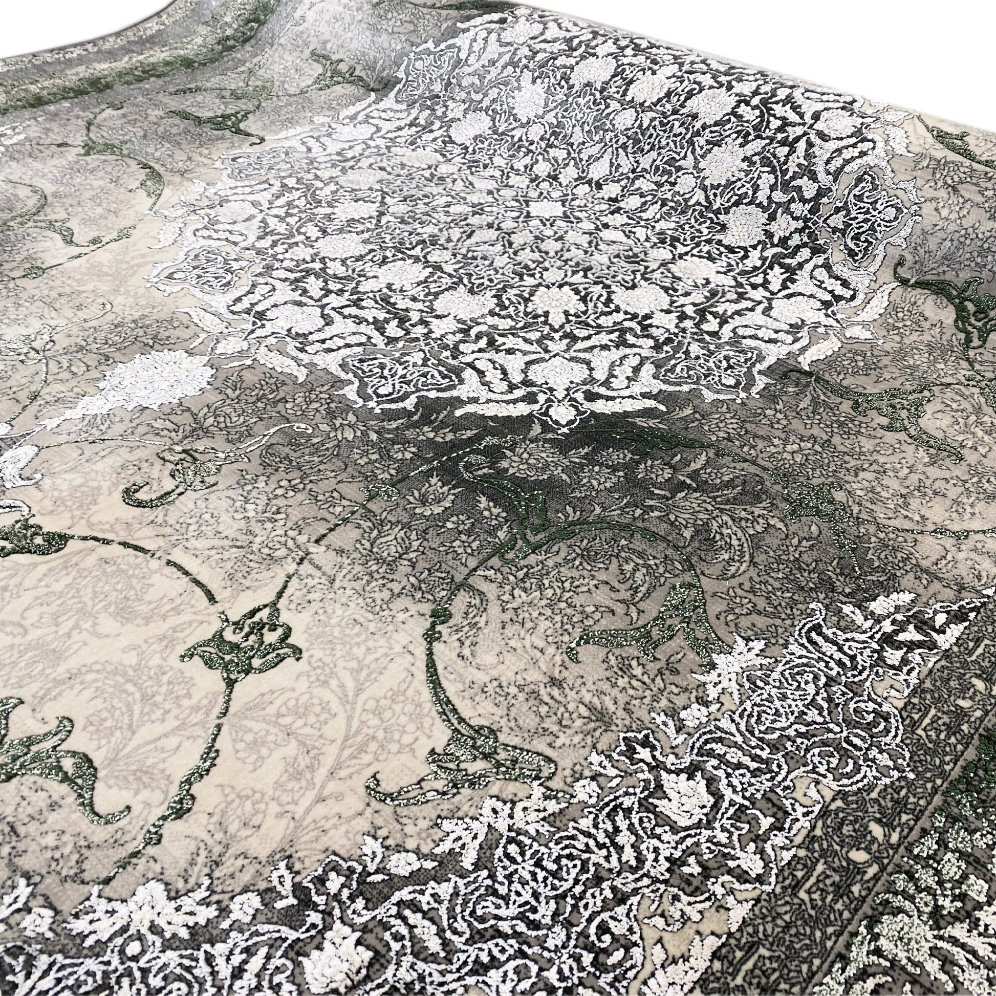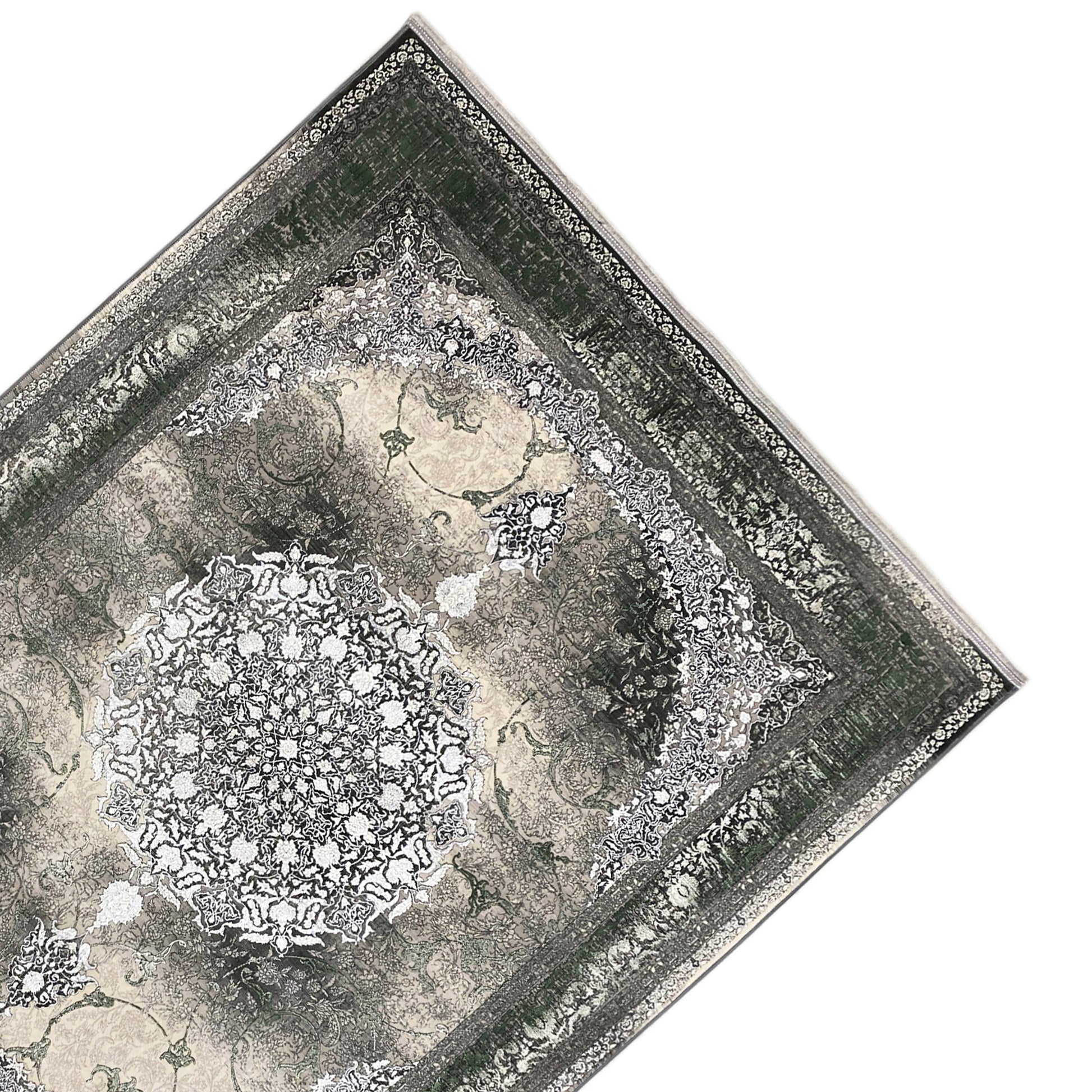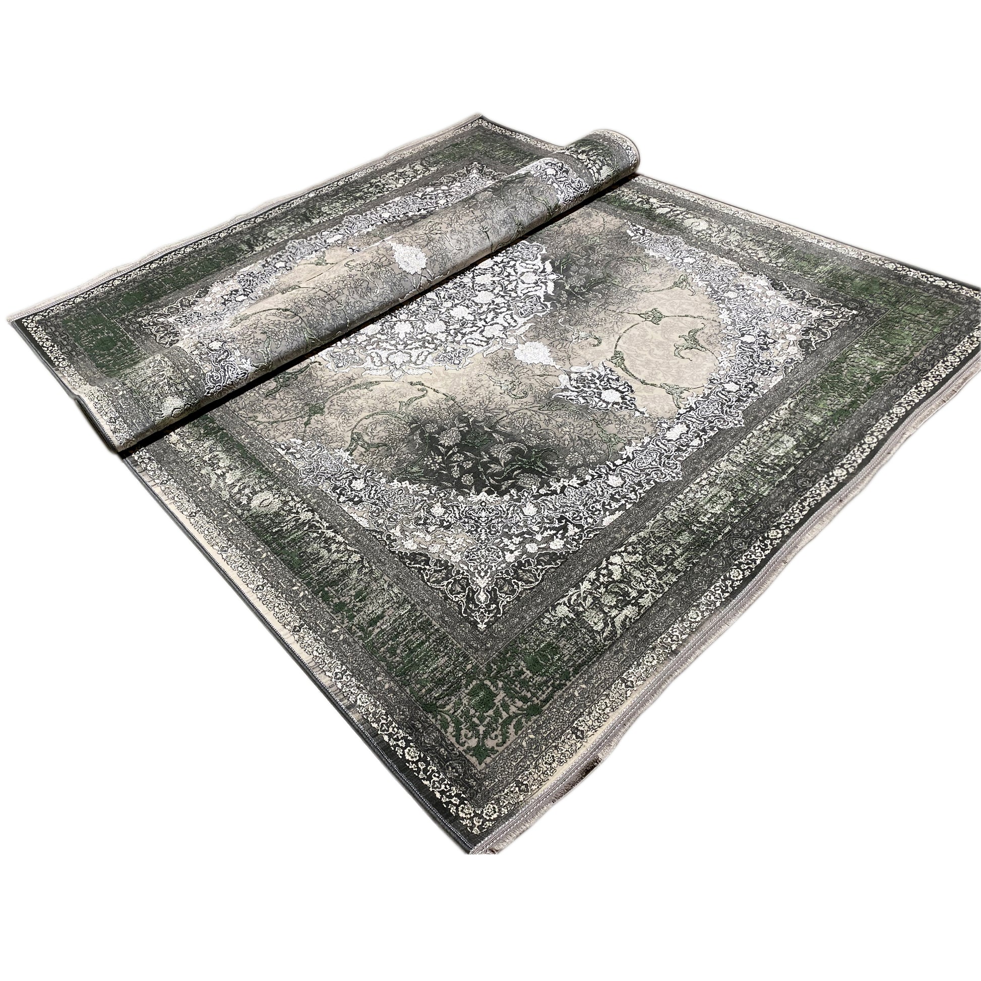 Dona alla tua casa un tocco di elegante lusso con questo splendido tappeto classico. Il raffinato medaglione centrale in tonalità grigio chiaro e crema si staglia su uno sfondo fumoso e leggermente sbiadito, incorniciato da un bordo verde intenso. Realizzato in 100% acrilico trattato termicamente, questo tappeto morbido e resistente è perfetto per aree ad alto traffico, combinando uno stile lussuoso con una moderna durabilità. Le dimensioni generose di 170x240cm sono ideali per aggiungere un punto focale elegante al tuo soggiorno o camera da letto.