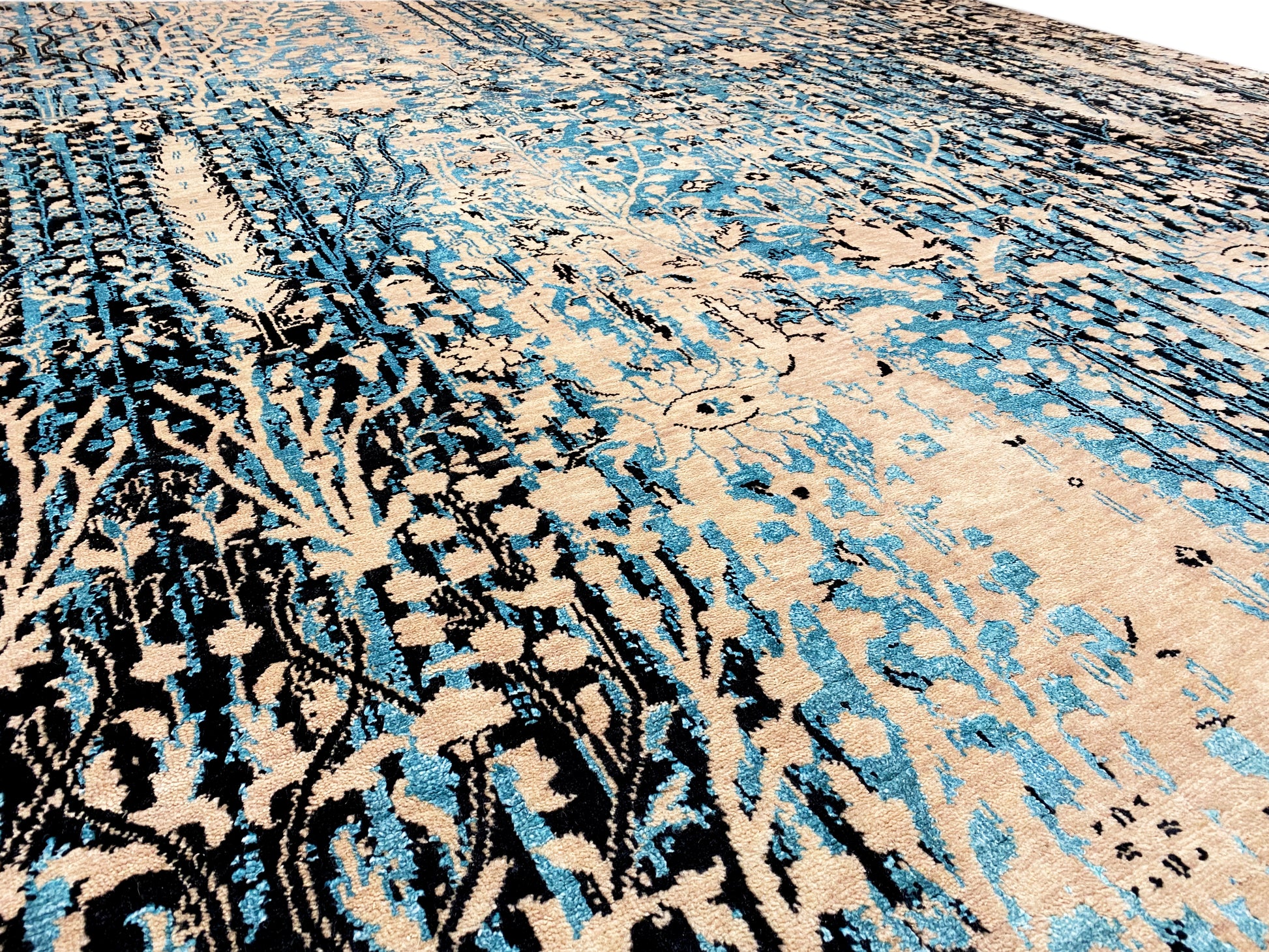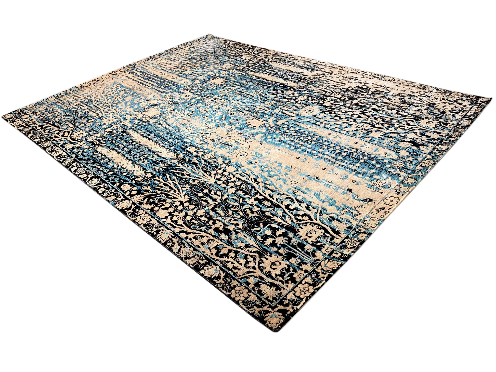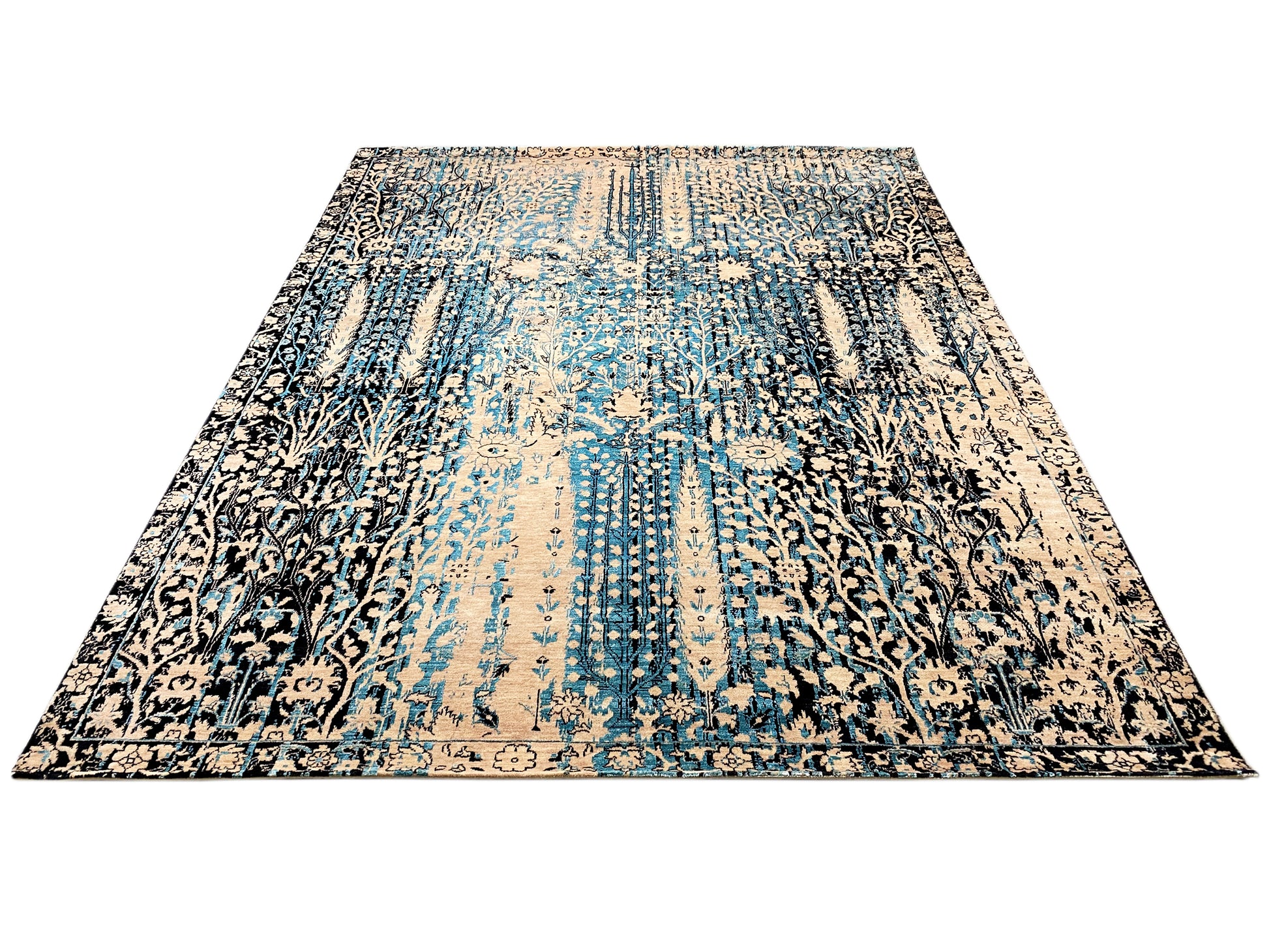 Questo tappeto di design annodato a mano, realizzato in lana di alta qualità e pregiata seta Saris, unisce materiali lussuosi a un design artistico. L'elegante combinazione di beige e blu conferisce a ogni ambiente un'atmosfera raffinata e moderna, adattandosi perfettamente a stili d'arredo classici, moderni e di lusso. Il motivo astratto-orientale con sottili elementi floreali crea un aspetto vintage unico, rendendo il tappeto un vero e proprio punto focale. Con le sue dimensioni di 306x242 cm, è ideale per ampi spazi abitativi e offre, oltre a una lucentezza elegante, anche grande comfort e qualità duratura.