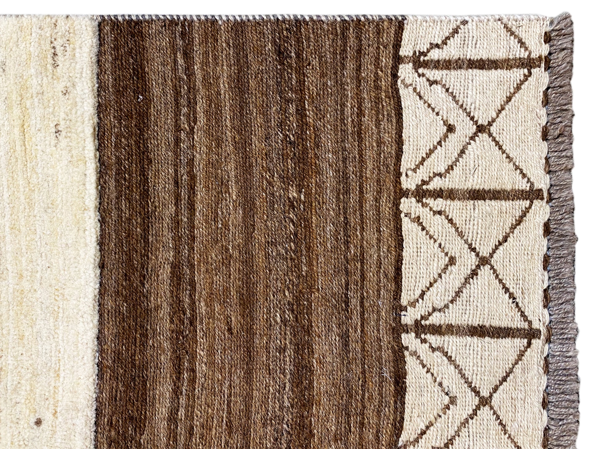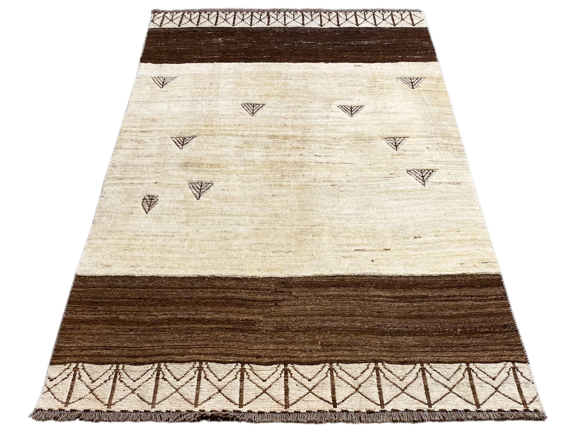 Questo tappeto Kelim Gabbeh tessuto a mano in 100% lana filata a mano combina una base beige calda con bordi marroni marcati e discreti motivi tribali geometrici. Con una dimensione di 185x123 cm, è ideale per soggiorni e camere da letto e si integra perfettamente con stili d’arredo moderni, boho e minimalisti. Il motivo ridotto con piccoli elementi simbolici conferisce al tappeto un aspetto tranquillo ed elegante, mentre la qualità superiore della lana garantisce durata, resistenza e una piacevole sensazione morbida al tatto – perfetto per un ambiente elegante e accogliente.